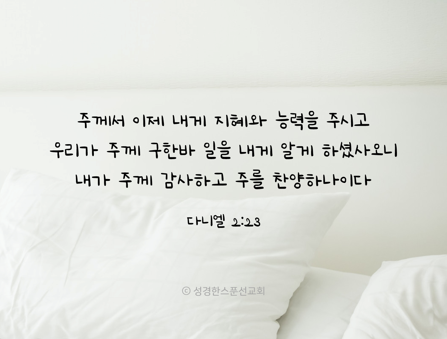 🔅오늘의 성경 한스푼/말씀카드 주께서 이제 내게 지혜와 능력을 주시고 우리가 주께 구한바 일을 내게 알게 하셨사오니 bibleonespoon 2022. 11. 4. 08:17 핸드폰 배경화면, SNS 프로필 사진, 암송카드 등 개인적인 용도로는 자유롭게 활용하셔도 좋습니다. (2-3초간 꾹 누르시면 이미지 저장이 가능합니다♡) 공유하기 게시글 관리 성경한스푼선교회 '🔅오늘의 성경 한스푼/말씀카드' Related Articles 지극히 높으신 하나님이 내게 행하신 이적과 기사를 내가 알게 하기를 즐겨하노라 그 하나님 밖에는 다른 신을 섬기지 아니하며 그에게 절하지 아니한 종들을 구원하셨도다 일의 결국을 다 들었으니 하나님을 경외하고 그의 명령들을 지킬지어다 하나님이 다니엘로 하여금 환관장에게 은혜와 긍휼을 얻게 하신지라
