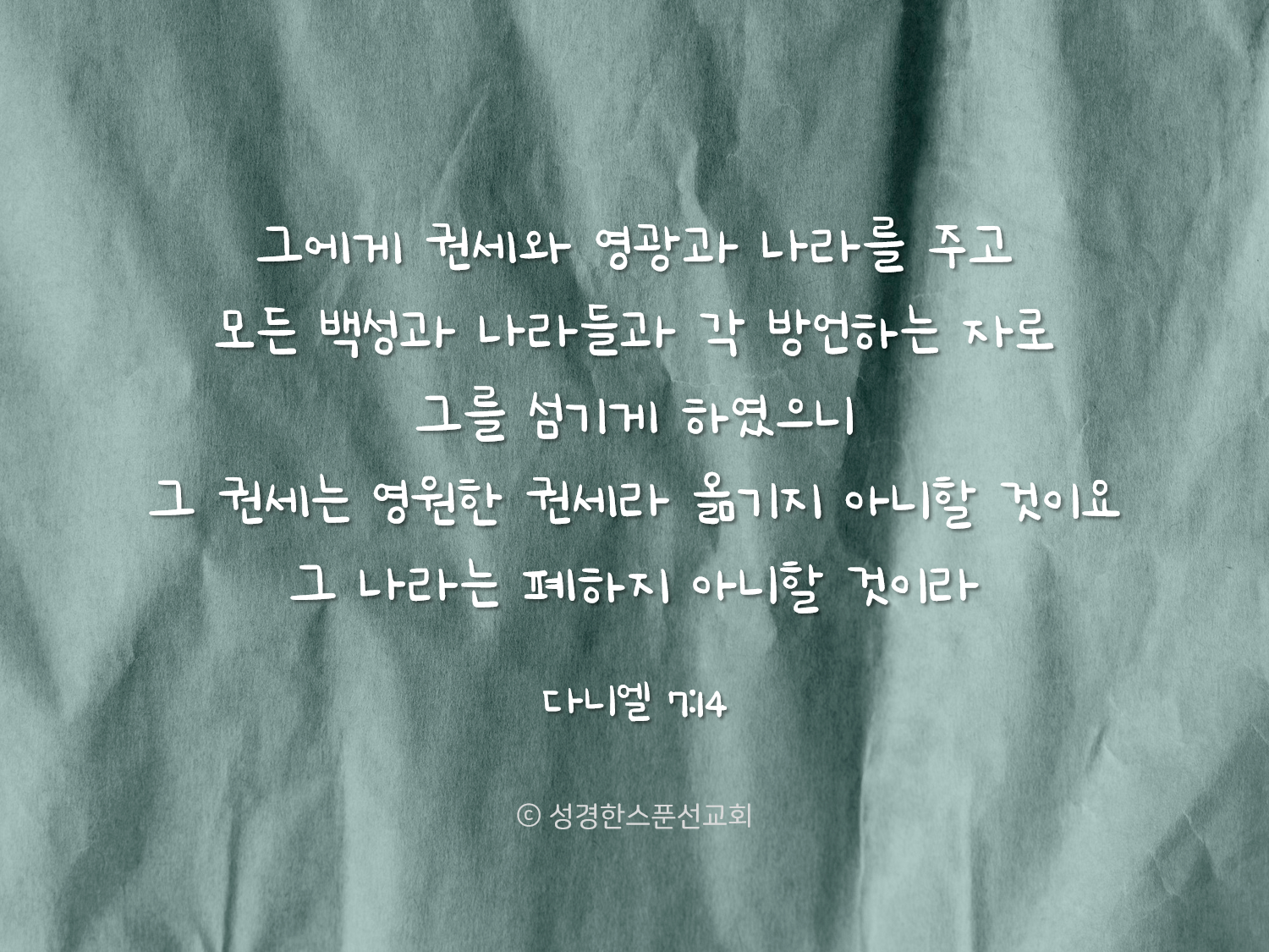 🔅오늘의 성경 한스푼/말씀카드 그 권세는 영원한 권세라 옮기지 아니할 것이요 그 나라는 폐하지 아니할 것이라 bibleonespoon 2022. 11. 15. 06:25 핸드폰 배경화면, SNS 프로필 사진, 암송카드 등 개인적인 용도로는 자유롭게 활용하셔도 좋습니다. (2-3초간 꾹 누르시면 이미지 저장이 가능합니다♡) 공유하기 게시글 관리 성경한스푼선교회 '🔅오늘의 성경 한스푼/말씀카드' Related Articles 무릇 그리스도 예수 안에서 경건하게 살고자 하는 자는 핍박을 받으리라 옛적부터 항상 계신 자가 와서 지극히 높으신 자의 성도를 위하여 신원하셨고 때가 이르매 성도가 나라를 얻었더라 그들이 다니엘을 굴에서 올린즉 그 몸이 조금도 상하지 아니하였으니 이는 그가 자기 하나님을 의뢰함이었더라 여호와를 경외하는 것이 지식의 근본이거늘 미련한 자는 지혜와 훈계를 멸시하느니라