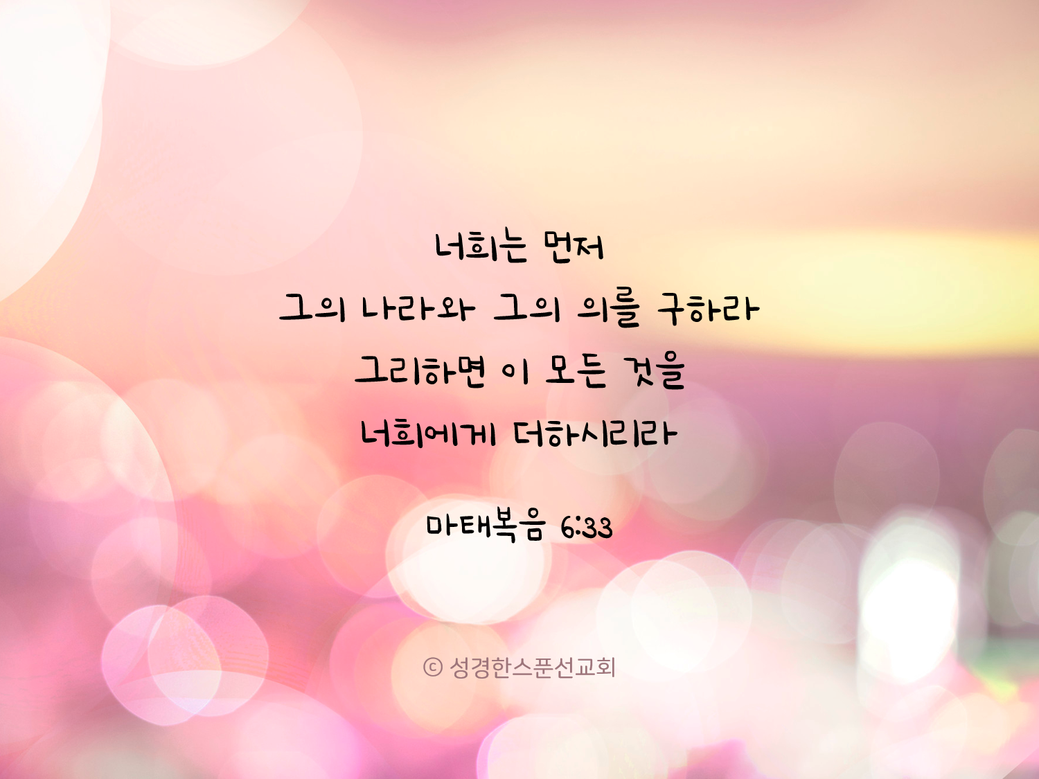 🔅오늘의 성경 한스푼/말씀카드 너희는 먼저 그 나라와 그의 의를 구하라 그리하면 이 모든 것을 너희에게 더하시리라 bibleonespoon 2023. 1. 31. 08:04 핸드폰 배경화면, SNS 프로필 사진, 암송카드 등 개인적인 용도로는 자유롭게 활용하셔도 좋습니다. (2-3초간 꾹 누르시면 이미지 저장이 가능합니다♡) 공유하기 게시글 관리 성경한스푼선교회 '🔅오늘의 성경 한스푼/말씀카드' Related Articles 생명으로 인도하는 문은 좁고 길이 협착하여 찾는 이가 적음이니라 어찌하여 형제의 눈 속에 있는 티는 보고 네 눈 속에 있는 들보는 깨닫지 못하느냐 뜻이 하늘에서 이룬 것 같이 땅에서도 이루어지이다 그들로 너희 착한 행실을 보고 하늘에 계신 너희 아버지께 영광을 돌리게 하라