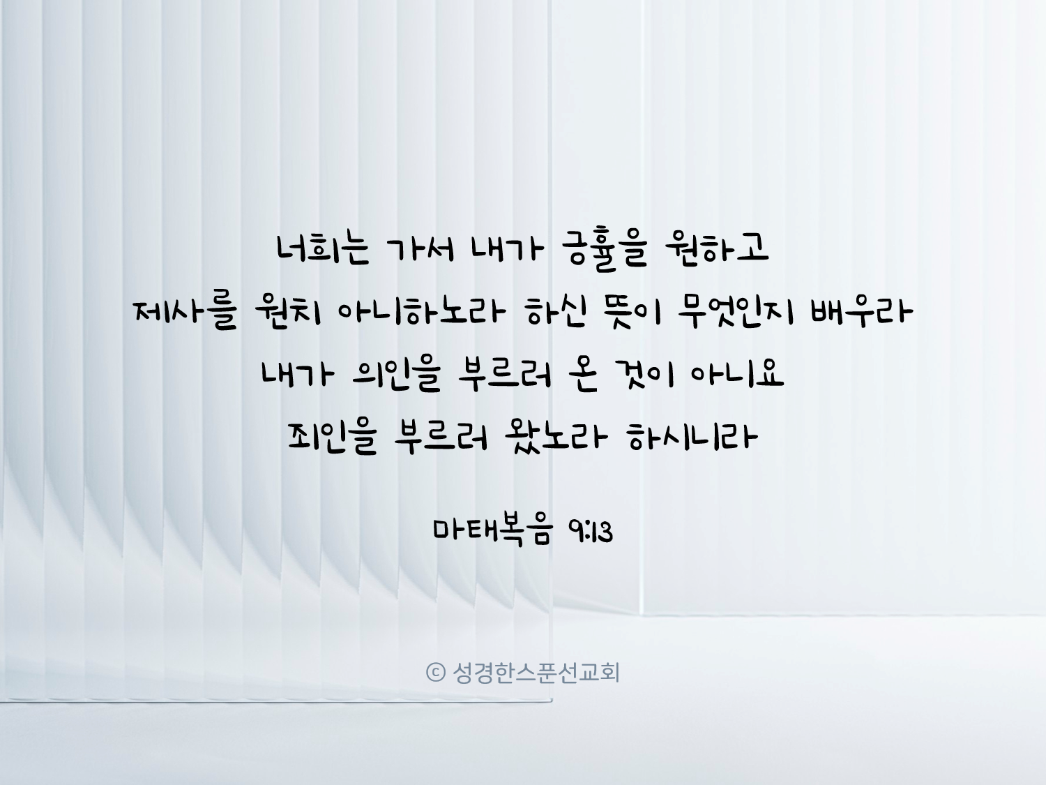 🔅오늘의 성경 한스푼/말씀카드 내가 의인을 부르러 온 것이 아니요 죄인을 부르러 왔노 bibleonespoon 2023. 2. 7. 08:10 핸드폰 배경화면, SNS 프로필 사진, 암송카드 등 개인적인 용도로는 자유롭게 활용하셔도 좋습니다. (2-3초간 꾹 누르시면 이미지 저장이 가능합니다♡) 공유하기 게시글 관리 성경한스푼선교회 '🔅오늘의 성경 한스푼/말씀카드' Related Articles 이에 제자들에게 이르시되 추수할 것은 많되 일꾼은 적으니 예수께서 돌이켜 그를 보시며 가라사대 딸아 안심하라 네 믿음이 너를 구원하였다 하시니 바람과 바다를 꾸짖으신대 아주 잔잔하게 되거늘 그러므로 누구든지 나의 이 말을 듣고 행하는 자는 그 집을 반석 위에 지은 지혜로운 사람 같으리